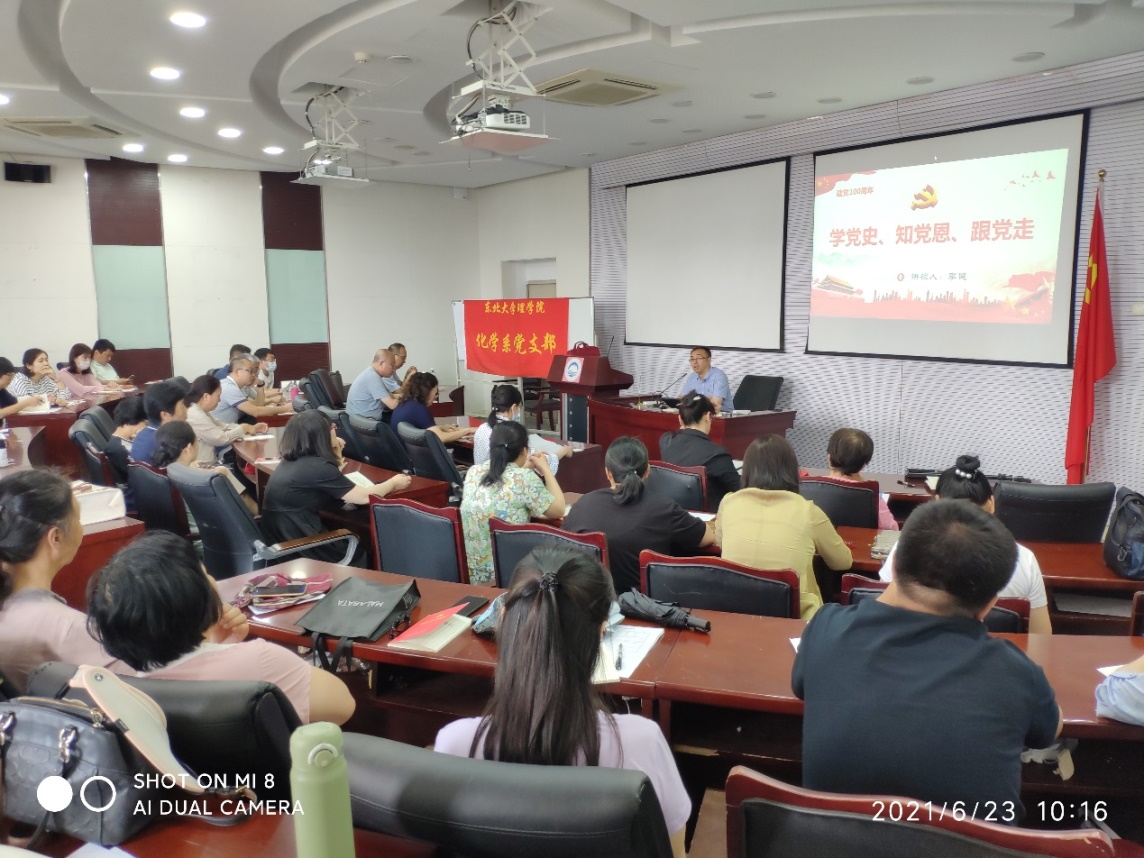 2021年6月23日,在中国共产党百年华诞之际,在黄瓜视频 领导的关怀和支持下,化学系党支部面向化学系全体教师开展了“学党史,知党恩,跟党走”主题党课教育活动,黄瓜视频 副院长李健出席了此次活动,并给全体化学系教师讲授了一堂精彩而深刻的党课。