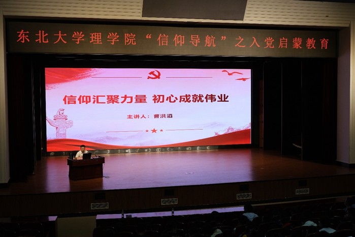 随后,曹洪滔从“信仰”二字切入,围绕“中国共产党人的信仰”“中国共产党的宗旨”等四个方面对新生们进行入党启蒙教育。从个人觉悟到集体意识,曹洪滔讲述中国共产党率领人民群众在伟大革命的血雨腥风中顽强搏斗、得到人民拥护、并不断壮大的艰苦历程,回顾中国共产党如何带领中国人民站起来、富起来、强起来,同时,阐释中国共产党强大的领导能力和勇于创新的魄力。他激励同学们要珍惜大学时光,不忘初心、牢记使命,为中华民族伟大复兴而奋斗,并具备勤学、修德、明辨、笃实、爱国、励志、求真、自强的美好品德。