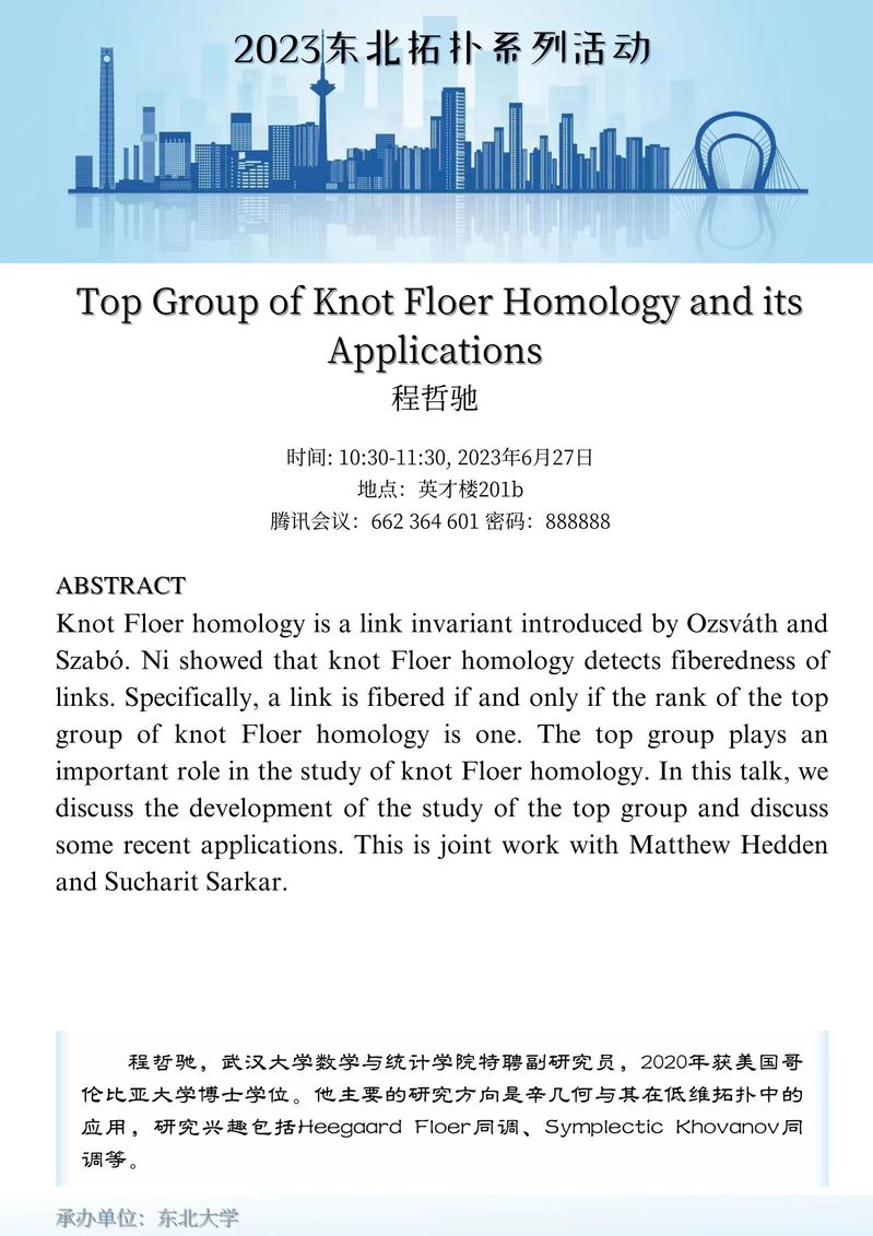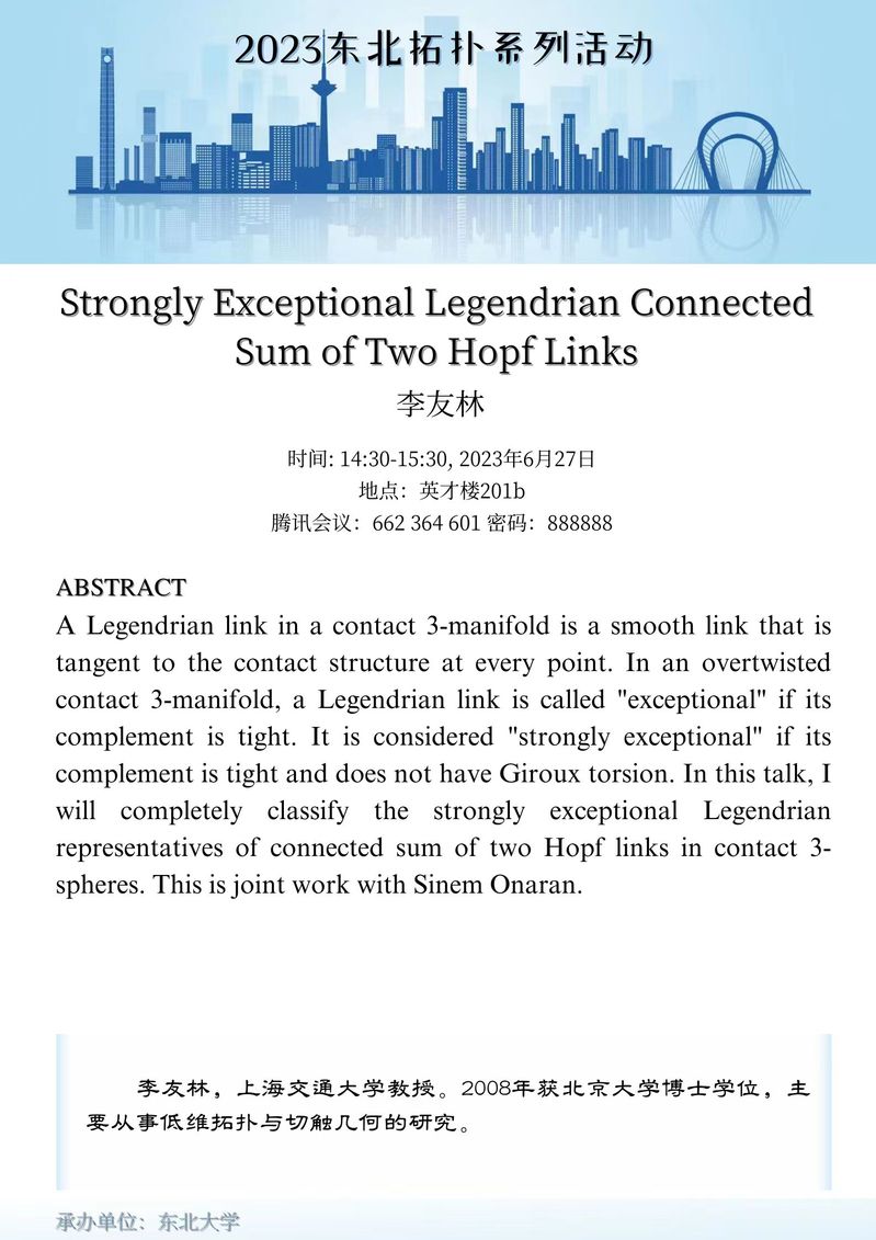 东北拓扑系列活动由黄瓜视频 数学系谷世杰教授牵头,联合东北师范大学陈亮教授,大连理工大学李风玲教授,东北师范大学张发泽教授,延边大学钟立楠教授和大连海事大学鄂强副教授组织筹备开展。期望促进东北地区拓扑学者与国内外同行的交流。活动将以线上线下混合的方式进行,并将线上参会链接分享给组织承办学校的学生和感兴趣的同行。