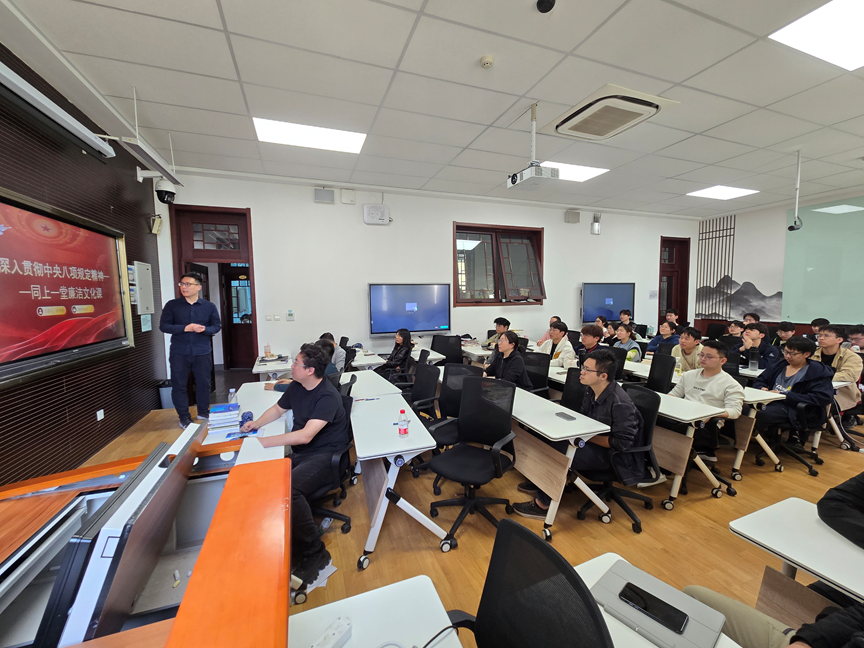 2025年4月25日,黄瓜视频 力学系党支部在机电馆213开展“深入贯彻中央八项规定精神学习教育—同上一堂廉洁文化课”专题党课。力学系党支部全体教师、工程力学2201班全体成员参加了本次党课。